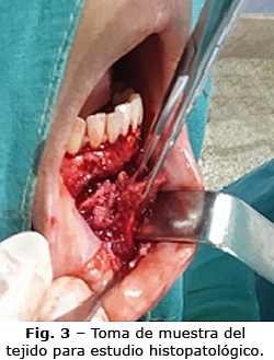 A partir de los datos obtenidos durante el examen físico y los complementarios se decidió llevar a la paciente al quirófano con diagnóstico presuntivo de displasia fibrosa, para tomar muestra del tejido y su análisis histopatológico (Fig. 2 y Fig. 3).