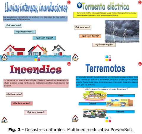 El módulo "desastres naturales" expone la definición. La multimedia contiene además un módulo de "consejos básicos" ante cualquier desastre natural. Dentro de cada pestaña se encuentran los respectivos botones para regresar a la pantalla principal y salir de la multimedia. En el módulo "tipos de desastres" (Fig. 2) se muestran los diferentes desastres naturales, en cada uno de ellos se encuentra su definición y la explicación del procedimiento a tener en cuenta antes, durante y después de este (Fig. 3).