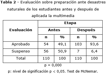 Antes de aplicar la multimedia educativa, más de la mitad (50,9 %) de los estudiantes presentaron una evaluación de suspenso, mientras que después de aplicada, esa cantidad decreció a 6,4 %, resultó aprobado el 93,6 % (tabla 2).