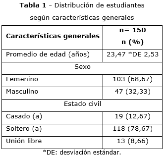 En la tabla 1 se muestra la distribución de los estudiantes, en relación con las características generales. Se destaca el promedio de edad de 23,47 años, con una DE= 2,53 años; el 68,67 % de los estudiantes era del sexo femenino y el 78,67 % eran solteros.