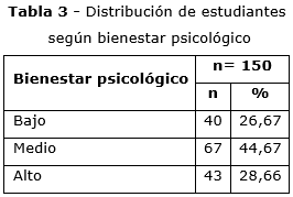 La tabla 3 muestra la distribución de los estudiantes según el bienestar psicológico. Predominó el nivel de bienestar psicológico medio (44,67 %), seguido del bajo (26,67 %).