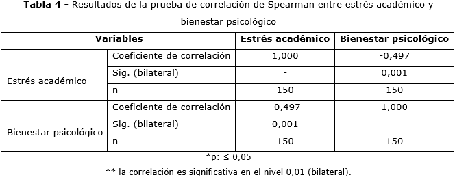 La prueba de Spearman muestra una correlación negativa media entre las variables estrés académico y bienestar psicológico; valor de correlación de -0,497 (p= 0,001). Tabla 4
