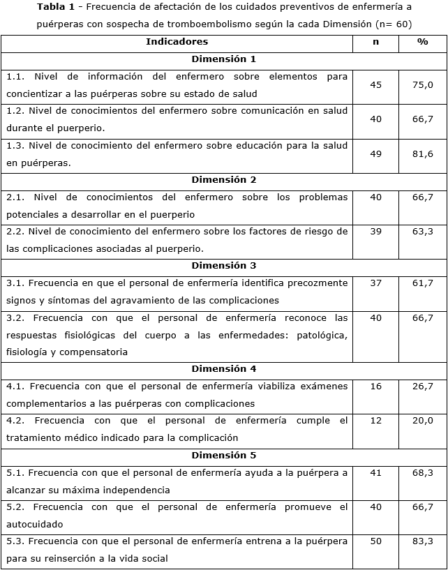 An observational, descriptive, cross-sectional study was conducted in a sample of nursing staff (n= 60). The complex variable: preventive nursing care for postpartum women with suspected thromboembolism in the ICU context was studied. It was operationalized in 5 dimensions and 12 indicators, with qualitative and quantitative measurement criteria for each indicator, classified into 5 categories. A frequency analysis was performed.