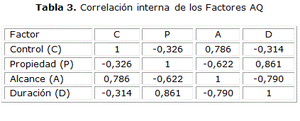 En cuanto a la correlación interna entre los factores del AQ y su interpretación mediante el coeficiente de correlación de Pearson (tabla 2 y tabla 3) se muestra que: entre el control y propiedad la correlación es negativa y débil (r= -0,326); entre control - alcance (r= 0,786) es positiva y fuerte; entre el control y la duración tiene una correlación negativa y de débil (r= -0,314); para propiedad-alcance, (r= -0,662) es también negativa y medianamente fuerte. En el caso propiedad-duración, la correlación es positiva y fuerte (r= 0,861). Entre los factores duración-alcance, (r= -790) es fuerte y positiva.