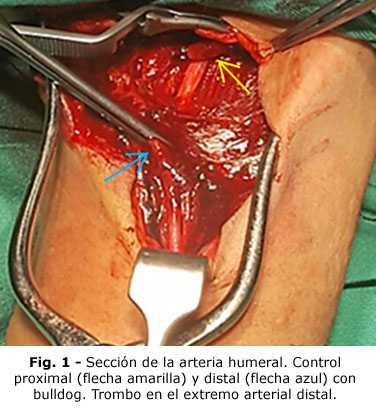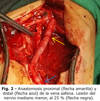 Acto quirúrgico: anestesia general orotraqueal, se utilizó un torniquete proximal, se realizó asepsia y antisepsia, y cubrió con paños de campo. Se encontró sección total de la arteria humeral izquierda, retracción de ambos extremos (Fig. 1) y presencia de coágulo en el extremo distal. Había sangrado activo por el proximal al aflojar el torniquete. Se colocaron clanes vasculares en ambos extremos, previa administración de 5000 UI de heparina sódica, se resecaron los cabos dañados, se extrajo coágulo del segmento distal. Se removieron 10 centímetros de la vena safena mayor, del miembro inferior izquierdo.