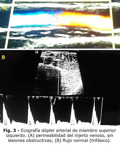 El paciente se trasladó a la sala de hospitalización ocho horas después. Al segundo día, refirió estar mejor, sin dolor, ni secuelas neurológicas. Pulsos distales presentes, hemoglobina en 10,4 g/L. Al tercer día egresó con seguimiento por consulta externa de cirugía vascular y fisiatría; tratamiento médico con cefalexina (500 mg), una cápsula cada 8 horas por tres días y clopidogrel (75 mg), 1 tableta diaria por 30 días. El paciente no asistió al seguimiento y reingresó 11 meses después de la cirugía, por quemaduras en tronco y extremidades. Se indicó ecografía dópler vascular de brazo izquierdo, se constata permeabilidad del injerto (Fig 3).