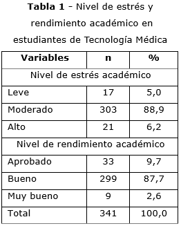De 341 estudiantes que constituyeron la muestra, 90 % tenía entre 17 a 25 años y 58,4 % fue de sexo femenino. Además, se obtuvo que el 88,9 % presentó estrés académico moderado y un 87,7 % buen rendimiento académico, como se muestra en la tabla 1.