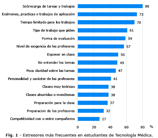 En la figura 1 se observa que los estresores más frecuentes fueron la sobrecarga de tareas y trabajos (80 %); los exámenes, prácticas o trabajos de aplicación (73 %); el tiempo limitado para los trabajos (70 %); el tipo de trabajo que piden los docentes (61 %); la forma de evaluación 59 % y el nivel de exigencia de los profesores (57 %).