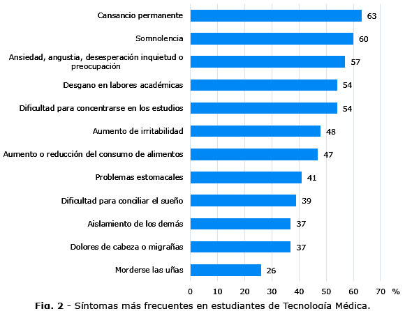 En la figura 2 se puede apreciar que los síntomas más frecuentes que refirieron los estudiantes fueron cansancio permanente (63 %); somnolencia (60 %); ansiedad, angustia, desesperación, inquietud o preocupación (57 %); desgano en labores académicas y dificultad para concentrarse en los estudios (54 %).