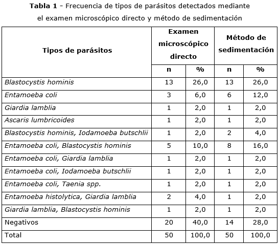 De las 50 muestras analizadas por el examen microscópico directo, el 64,0 % resultaron positivos y 36,0 % negativos. Por otro lado, las muestras analizadas por método de sedimentación obtuvieron 72,0 % de resultados positivos y 28,0 % negativos. El parásito detectado con mayor frecuencia en ambos métodos fue Blastocystis hominis, con 26,0 % en ambos métodos, seguidos por Entamoeba coli, con 6,0 % y 12,0 %. Entre los biparasitados, con mayor frecuencia fueron Entamoeba coli y Blastocystis hominis, con 10,0 % en el método de examen microscópico directo y 16,0 % en el método de sedimentación (tabla 1).