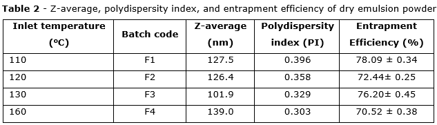 Z-average, polydispersity index, and entrapment efficiency of dry emulsion powder
