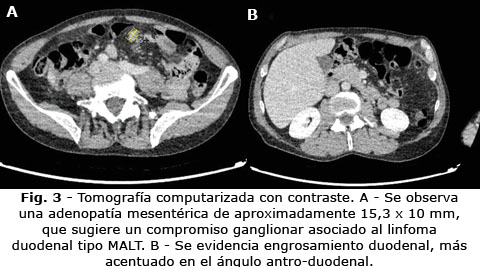 La tomografía computarizada abdominal mostró un discreto engrosamiento duodenal, junto con pronunciación del ángulo antro-duodenal, así como una adenopatía mesentérica de 15,3 x 10 mm, en el bulbo y de la segunda porción de duodeno (Fig. 3).