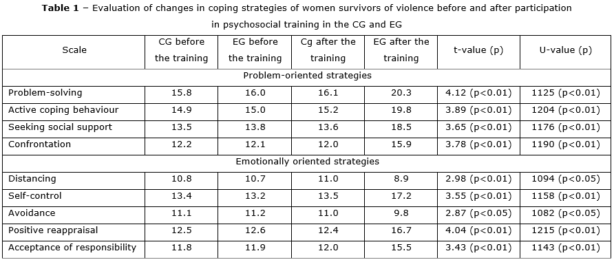 Using the WCQ or WCC, changes in the coping strategies of women survivors of violence were assessed before and after participation in psychosocial training to compare the results of the CG and EG to determine the effectiveness of the training, in particular, whether it helps to increase the use of adaptive coping strategies. The results are presented in table 1.