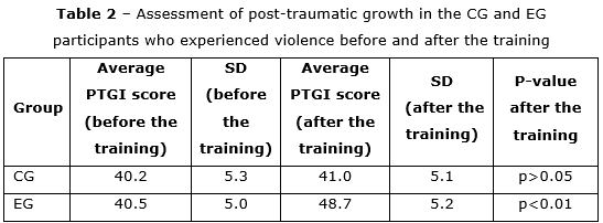 Before the training, as shown in the table, the average scores on each scale of coping strategies do not had statistically significant differences between the groups. The results show that both groups had a similar level of use of coping strategies at the beginning. After the training, the results show a statistically significant difference between CG and EG on most scales. The next step was to assess the post-traumatic growth of women survivors of violence in order to identify the impact of the training on their psychological state. The study includes the CG and EG, where the latter includes training aimed at developing adaptive skills to achieve post-traumatic growth. The results of the assessment are presented in table 2.