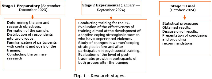 The research is an experimental, and includes the measurement of indicators before and after the intervention. The work took place in several stages; the content of each one is presented in figure 1. The participants were addressed to the Kyiv City Centre for Gender Equality, Prevention and Combating Violence for help in the period from January to September 2024.