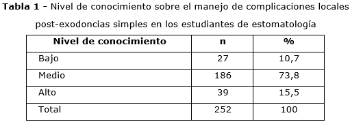 En relación con el nivel de conocimiento sobre el manejo de complicaciones locales post-exodoncias simples, el 73,8 % (n= 186) de los estudiantes presentó un nivel de conocimiento medio, seguido por un 15,5 % (n= 39) con nivel alto y un 10,7 % (n= 27) con nivel bajo (tabla 1).