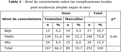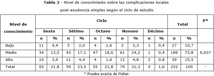 Methods: An observational, descriptive, and cross-sectional study was conducted in 252 students from cycles VI to X of the Stomatology degree. The target population consisted of students enrolled in these cycles during the 2021-II semester who had taken the subject of Oral Surgery or Oral Surgery I. A validated 12-item questionnaire was applied through a virtual survey. The variables studied were sex, academic cycle, and level of knowledge on the management of local complications post-extraction. Descriptive statistics and the Chi-square test were used to evaluate associations.