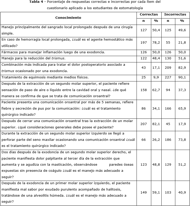 Respecto al desempeño en los ítems del cuestionario, se observó que la mayoría de los estudiantes, 198 (78,6 %) respondió de forma correcta que la hemorragia es una de las complicaciones más frecuentes tras una exodoncia. Asimismo, 211 (83,7 %) identificaron adecuadamente la importancia de brindar instrucciones postoperatorias claras al paciente para prevenir complicaciones. Por otro lado, 145 (57,5 %) reconocieron correctamente el uso de apósitos con eugenol en el manejo de la alveolitis seca. Sin embargo, solo 112 (44,4 %) sabían que la maniobra de Valsalva no se debe realizar en el postoperatorio inmediato en casos de sospecha de comunicación oroantral. Los resultados muestran que 187 estudiantes (74,2 %) respondieron correctamente que los antibióticos no se indican de forma rutinaria tras una exodoncia simple, mientras que 134 (53,2 %) identificaron el trismus como una complicación que puede generar dificultad para la apertura bucal. Por otro lado, menos de la mitad de los estudiantes 109 (43,3 %) respondieron correctamente sobre la aparición de equimosis en adultos mayores, como resultado de la fragilidad capilar. Finalmente, solo 97 (38,5 %) reconocieron el momento adecuado para iniciar el enjuague con agua tibia y sal después de una exodoncia, lo cual evidencia una menor comprensión de los cuidados postoperatorios básicos (tabla 4).