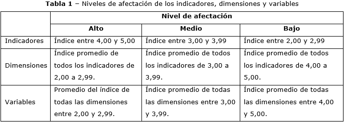 Para la medición del nivel de afectación de los indicadores, dimensiones y variable seleccionados, se utilizó la tabla de decisiones siguiente (tabla 1):(9)