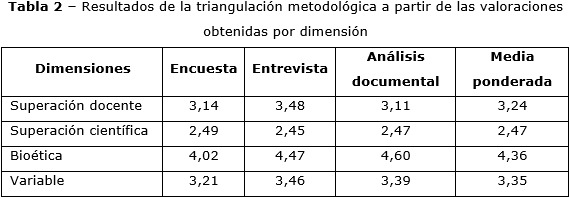 Resultados: La dimensión superación docente tuvo una afectación media al obtener un valor de afectación de 3,14; la superación científica mostró una afectación alta al tener todos sus indicadores evaluados con esa categoría y la dimensión bioética se evaluó como de dificultad baja con un valor de 4,02. El resultado final de la triangulación metodológica fue de 3,35; estimado como nivel medio de afectación.