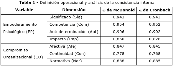 La variable independiente, EP, se refiere a cogniciones que favorecen pertenencia, autonomía y eficacia en el trabajo.(13) Ríos Manríquez M y otros(11) lo vinculan con acceso a información y control sobre el desempeño. Treviño Reyes R y otros(10) proponen cuatro dimensiones: significado, competencia, autodeterminación e impacto. La variable dependiente, CO, se define como identificación e involucramiento con la organización, estructurado en tres dimensiones: afectiva, de continuidad y normativa.(11,14) Adicionalmente, se analizaron las variables sociodemográficas, académicas y laborales de la muestra.