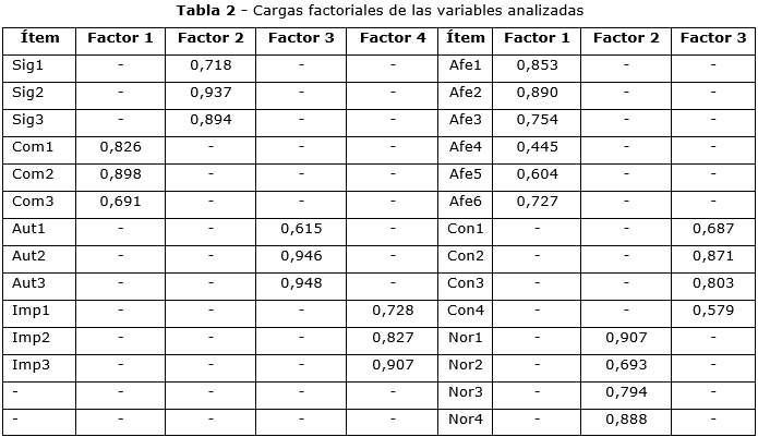 La validez estructural se confirmó mediante análisis factorial exploratorio (AFE) con máxima verosimilitud. Se obtuvieron agrupaciones claras y coherentes de los ítems según los modelos teóricos de EP de Spreitzer G(12) y CO de Meyer JP y otros.(13) Las cargas factoriales fueron mayoritariamente altas, sin solapamientos, lo que respalda su consistencia interna y la adecuación de las dimensiones evaluadas (tabla 2). Se utilizó la correlación de Spearman para analizar la relación entre EP y CO. Luego, se aplicó un análisis factorial confirmatorio (AFC) dentro del modelo de ecuaciones estructurales (SEM), mediante el estimador de mínimos cuadrados ponderados diagonalmente (DWLS). Finalmente, para explorar asociaciones entre variables categóricas y ordinales, se empleó la prueba exacta de Fisher.