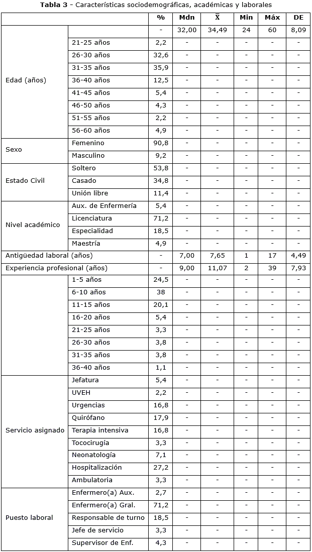 Entre las características sociodemográficas, académicas y laborales de los participantes se observó que el 90,8 % eran mujeres; el 68,5 % tenía entre 26 y 35 años; el 53,8 % era soltero(a); y el 71,2 % contaba con Licenciatura en Enfermería, mientras que solo el 23,4 % tenía estudios de posgrado. El 68 % registraba entre 1 y 9 años de antigüedad en la institución, con una media de 8 años (DE= 4,49). En cuanto a la experiencia profesional, el 68 % reportó entre 1 y 9 años; el 27,2 % laboraba en el área de hospitalización, y el 71 % ocupaba cargos operativos como personal de enfermería general (tabla 3).