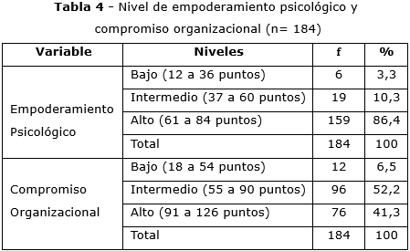 Methods: A quantitative, cross-sectional, correlational study was conducted with 184 nursing professionals. Validated scales were applied to measure EP (Spreitzer G) and OC (Meyer JP & Allen NJ), and Spearman's and Fisher's scores were used, as well as structural equation model analysis (SEM).