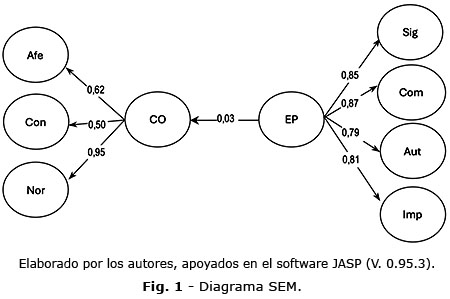 La correlación entre EP y CO fue baja y no significativa (p= 0,046). El análisis SEM reveló un efecto positivo y significativo de EP sobre CO (β= 0,03; p< 0,001), pero con un tamaño de efecto muy bajo y varianza explicada mínima (R²= 0,002). Aunque el modelo tuvo buen ajuste (CFI= 0,987; TLI= 0,985; RMSEA= 0,085) (Fig. 1).