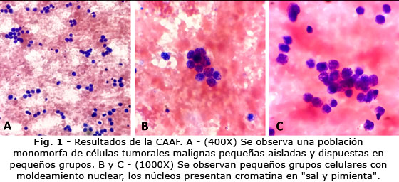 Se indicó citología por aspiración con aguja fina (CAAF) la cual informó: sistema Milán VI, compatible con carcinoma de células pequeñas (Fig. 1).