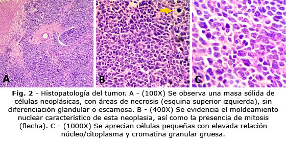 Los CCP, independientemente del sitio de origen, comparten características histológicas similares. Las células tienen el tamaño de 2 a 3 linfocitos maduros, su forma es redonda u ovalada, el citoplasma es escaso, los núcleos son densos e hipercromáticos, con cromatina granular gruesa. Su crecimiento es en forma de láminas sólidas, nidos o trabéculas; pueden contener áreas de necrosis y mitosis frecuentes.(7,12,13) La mayoría de estas características morfológicas coinciden con las observadas en este paciente.