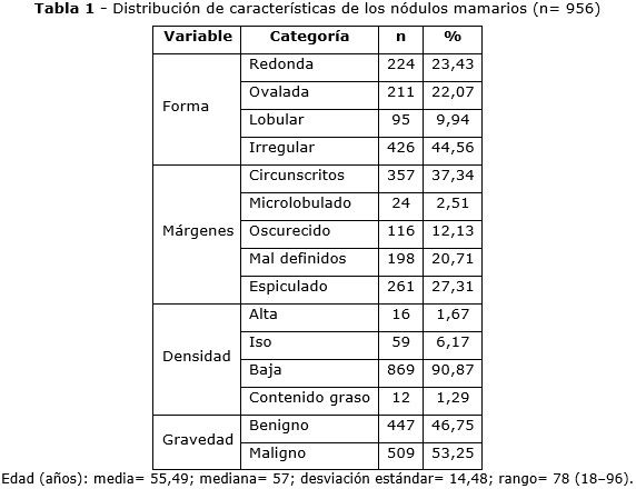 La distribución de los nódulos mamarios analizados mostró que la forma más frecuente fue la irregular, seguida por las redondas y ovaladas, mientras que las lobuladas fueron menos comunes. En cuanto a los márgenes, predominó el tipo circunscrito, seguido por los mal definidos y oscurecidos, y en menor proporción se observaron márgenes microlobulados y espiculados. La mayoría de los nódulos presentaron una densidad baja, siendo escasos los de densidad alta o con contenido graso. El 53,25 % de los casos fueron clasificados como malignos, mientras que el 46,8 % correspondieron a lesiones benignas. La edad de las pacientes osciló entre 18 y 96 años, con una media de 55,49 años y una desviación estándar de 14,48 años (tabla 1).
