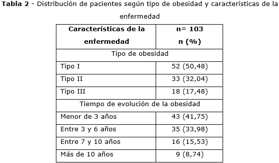 En la tabla 2 se muestra un predominio de pacientes con obesidad tipo I y con tiempo de evolución menor a 3 años.