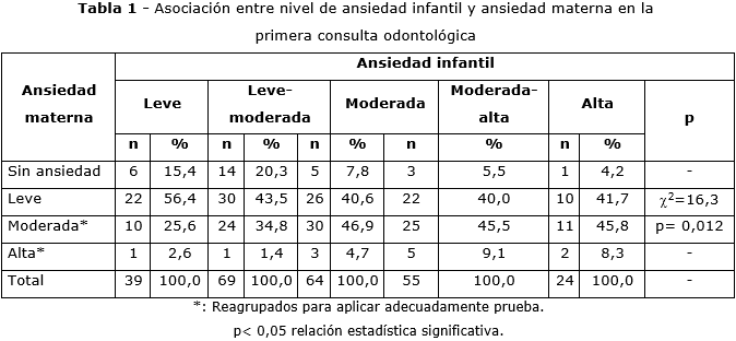 Conclusiones: Se evidenció una asociación entre la ansiedad infantil y materna durante la primera consulta odontológica. Estos hallazgos refuerzan la necesidad de implementar estrategias preventivas que involucren tanto al niño como a la madre.