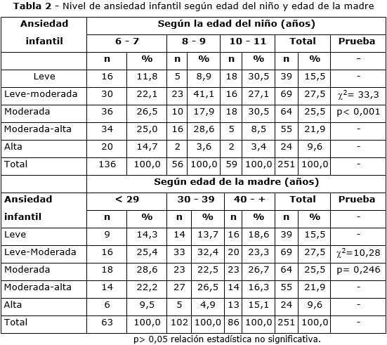 Al analizar la ansiedad infantil según la edad del niño, se encontró una asociación estadísticamente significativa (χ²= 33,3; p< 0,001). Los niños de 6 a 7 años presentaron con mayor frecuencia niveles de ansiedad moderada (26,5 %), moderada a alta (25,0 %) y alta (14,7 %), mientras que en el grupo de 10 a 11 años predominó la ansiedad leve (30,5 %). Asimismo, se evaluó la ansiedad infantil según la edad de la madre, sin encontrarse diferencias significativas entre los grupos etarios maternos (χ²= 10,28; p= 0,246) (tabla 2).