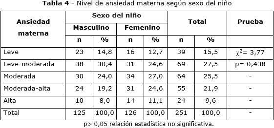Finalmente, se evaluó el nivel de ansiedad materna en función del sexo del niño, sin encontrarse diferencias estadísticamente significativas (χ²= 3,77; p= 0,438). Las madres de niños y niñas presentaron proporciones similares de ansiedad en todos los niveles. Esta información se detalla en la tabla 4.