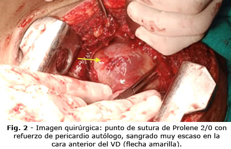 La sutura cardíaca es un procedimiento crítico de emergencia. Se utilizan sobre todo suturas de colchonero o de punto cruzado, las cuales pueden reforzarse con parches de teflón o con el propio pericardio del paciente.(1,2) En este caso, se optó por dos puntos de colchonero reforzados con pericardio.