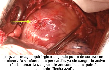 Bajo anestesia general, se realizó una toracotomía anterolateral izquierda (TAI), en la cual se halló hemotórax y derrame pericárdico. Se efectuó una pericardiotomía longitudinal, anterior al nervio frénico; esto permitió remover un gran coágulo y exponer una herida de 1,5 cm con sangrado activo en el VD. La lesión se reparó con puntos en colchonero de Prolene 2/0 y parche pericárdico autólogo (Fig. 2). Se necesitó realizar una segunda sutura por sangrado residual (Fig. 3). Tras la reparación, se descartaron lesiones adicionales. Se observaron signos de antracosis en el pulmón izquierdo, asociados al tabaquismo (Fig. 3). Se aspiraron los coágulos residuales y se irrigó la cavidad con solución salina. Tras recibir 4 unidades de sangre, el paciente pasó a la unidad de cuidados intensivos, donde se administró ceftriaxona (1 g i.v. cada 12 h).