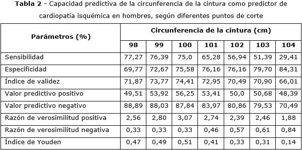 Conclusiones: La circunferencia de cintura de 100 cm en hombres y 99 cm en mujeres es un predictor de cardiopatía isquémica en pacientes con diabetes mellitus tipo 2.