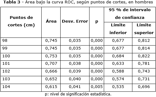 De igual forma, un estudio realizado en Polonia(21) con 4735 pacientes (33,6 % hombres) de entre 45 y 64 años de edad, encontró un punto de corte óptimo de la Cci como predictor de riesgo cardiometabólico en hombres de 100 cm con una sensibilidad del 73,0 %, una especificidad del 87,3 %, área bajo la curva ROC= 0,887 (IC del 95 % = 0,871-0,903); mientras que para las mujeres fue de 87,0 cm con una sensibilidad del 83,3 %, una especificidad del 81,6 %, área bajo la curva ROC= 0,905 (IC del 95 % = 0,895-0,915).