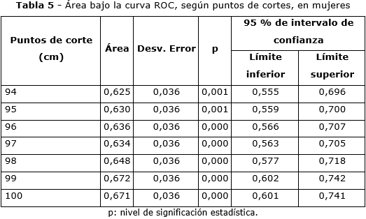 Por su parte, en el caso de las mujeres (tabla 4 y tabla 5), el punto de corte de Cci se situó en 99 cm con una sensibilidad del 56,9 %, una especificidad del 77,4 %, un valor predictivo positivo del 64,4 % y negativo del 71,4 % (Área bajo la curva ROC= 0,672; intervalo de confianza del 95 % = 0,602-0,742; p= 0,000).