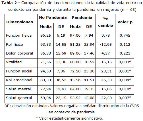Al comparar al total de la muestra (n = 154) entre las evaluaciones en contexto sin pandemia y con pandemia, se observó una disminución de la calidad de vida en las dimensiones vitalidad (p = 0,004), función social (p = 0,001), rol emocional (p = 0,001), salud mental (p = 0,003) y salud general (p = 0,001). Las dimensiones más alteradas fueron el rol emocional y la salud general, las cuales disminuyeron un 39,5 % y 21,0 %, respectivamente (tabla 1).