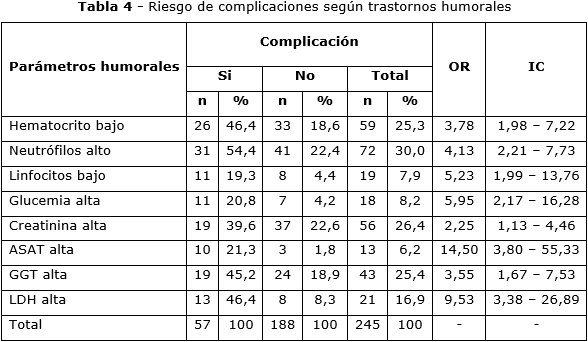 La tabla 4 muestra únicamente las desviaciones de la normalidad de los parámetros humorales que fueron factores de riesgo para complicaciones. En esta condición se encontraron los valores bajos de hematocrito (OR = 3,78; IC: 1,98 - 7,22) y linfocitos (OR = 5,23; IC: 1,99 - 13,76). También fueron factores de riesgo los valores altos de neutrófilos (OR = 4,13; IC: 2,21 - 7,73), glucemia (OR = 5,95; IC: 2,17 - 16,28), creatinina (OR = 2,25; IC: 1,13 - 4,46), ASAT (OR = 14,50; IC: 3,80 - 55,33), GGT (OR = 3,55; IC: 1,67 - 7,53) y LDH (OR = 9,53; IC: 3,38 - 26,89). El resto de las desviaciones en los parámetros humorales tuvieron efecto nulo sobre el riesgo de complicaciones.